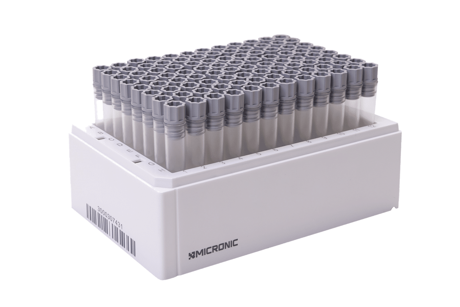 Opbevaringsrørene er forsynet med en alfanumerisk eller unik 2D-data-matrix-kode, der er laserkrypteret på rørets bund for at muliggøre nem identifikation og sporbar prøveopbevaring. Micronic 2,00 ml-hætteglassene fås som standard i 96-brønds formatet Micronic 96-5 Rack og som ekstraudstyr i bulk.
