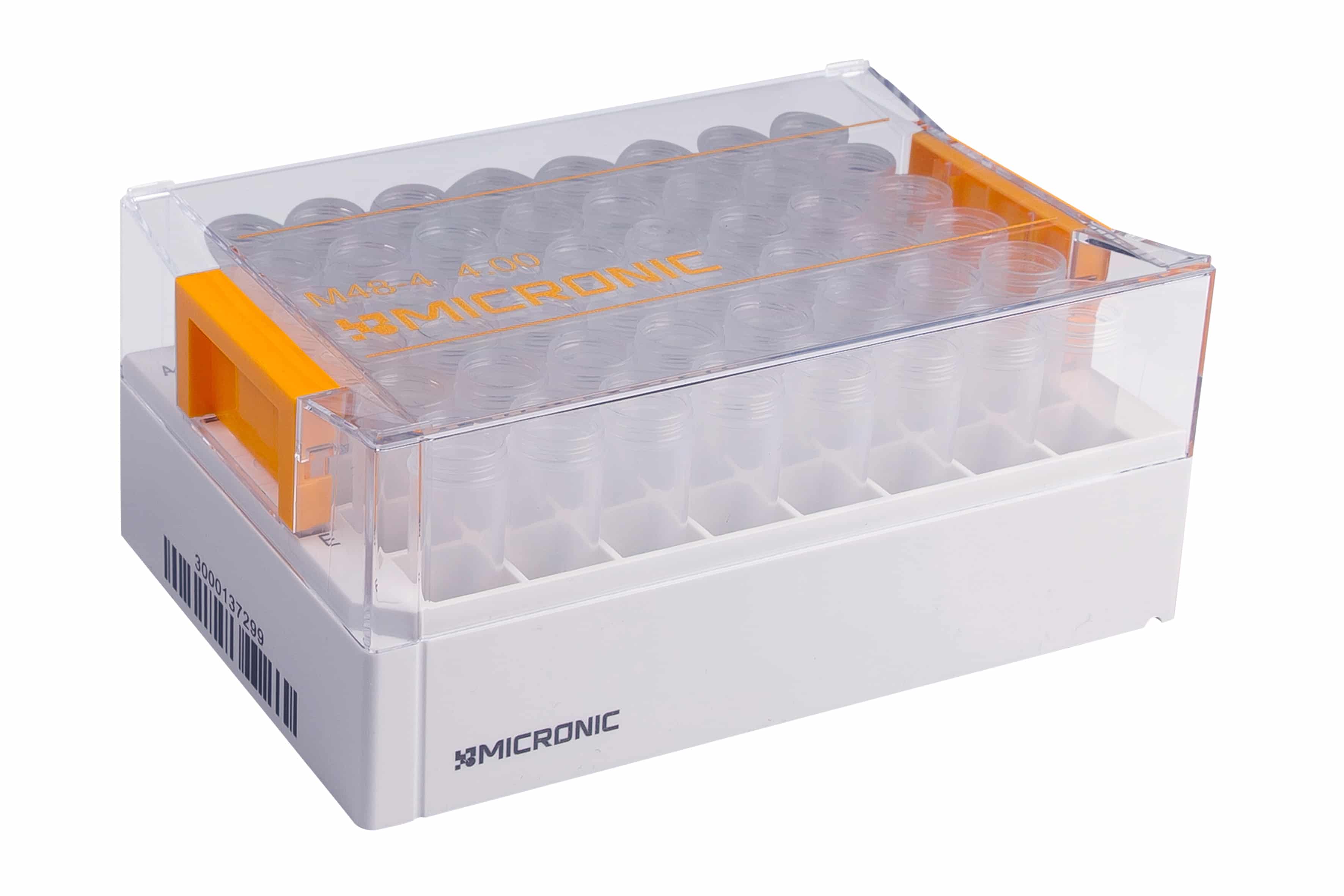 Rørene på 4,00 ml fås som standard med 2D-data-matrix-koder, rackene er 1D-stregkodede, og koderne er permanent lasergraverede.
