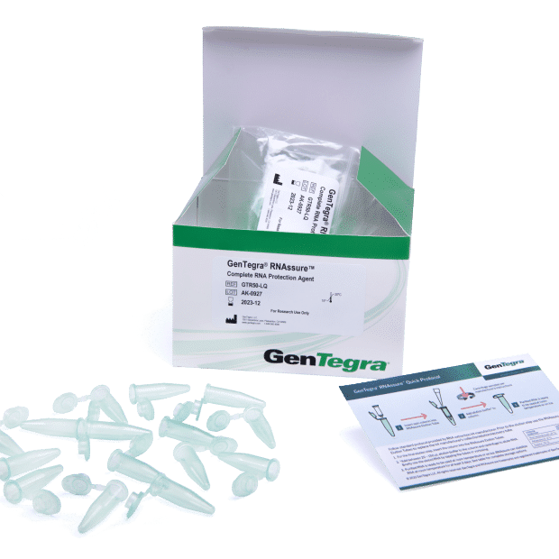 Hvis du ønsker fuld beskyttelse af dine RNA-prøver umiddelbart efter isolering, giver behandling af rensede RNA-prøver med GenTegra RNAssure de bedste resultater. GenTegra RNAssure beskytter RNA mod alle RNaser samt mod oxidation. Det sker ved hjælp af GenTegras dokumenterede, patenterede Active Chemical Protection™ (ACP)-kemi. RNAssure kan beskytte RNA i mindst 3 dage ved stuetemperatur (RT) og 2 uger ved 4 °C. Det beskytter også RNA mod skade under DNase-behandling ved den højere temperatur på 37 °C. Derfor kan RNAssure eliminere risikoen for RNA-nedbrydning under daglige forsøgsprotokoller eller ved katastrofale frysernedbrud.