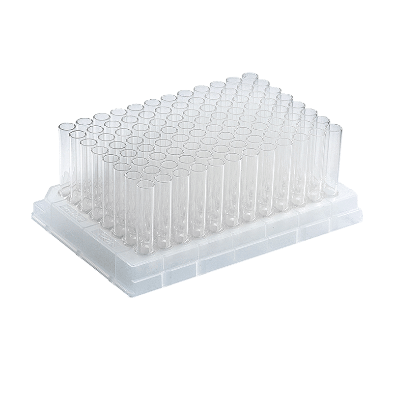 Pladen er fuldt fremstillet af polypropylen (PP), som er let, kemikalieresistent og udbredt i life science-industrien. Den har plads til i alt 96 inserts, som kan købes forfyldt og fastmonteret, som løse rør i bulk eller som plader uden rør. Plader med forfyldte glasrør leveres med rørene fastgjort i selve pladen. Alle plader leveres med et klart, beskyttende låg, så glasrørene ikke falder ud under transport eller opbevaring.