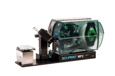 Sci-Print MP2 er en semi-automatisk etiketprinter, der printer og påfører etiketter på forskellige mikrotiterplader til prøvesporing.