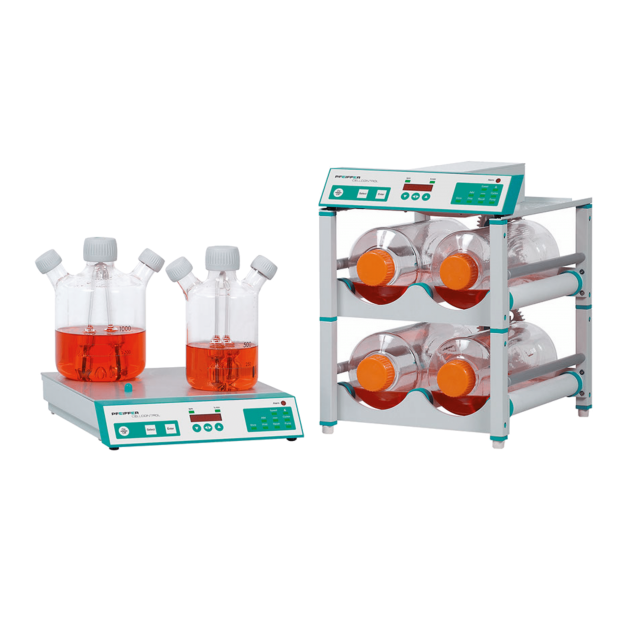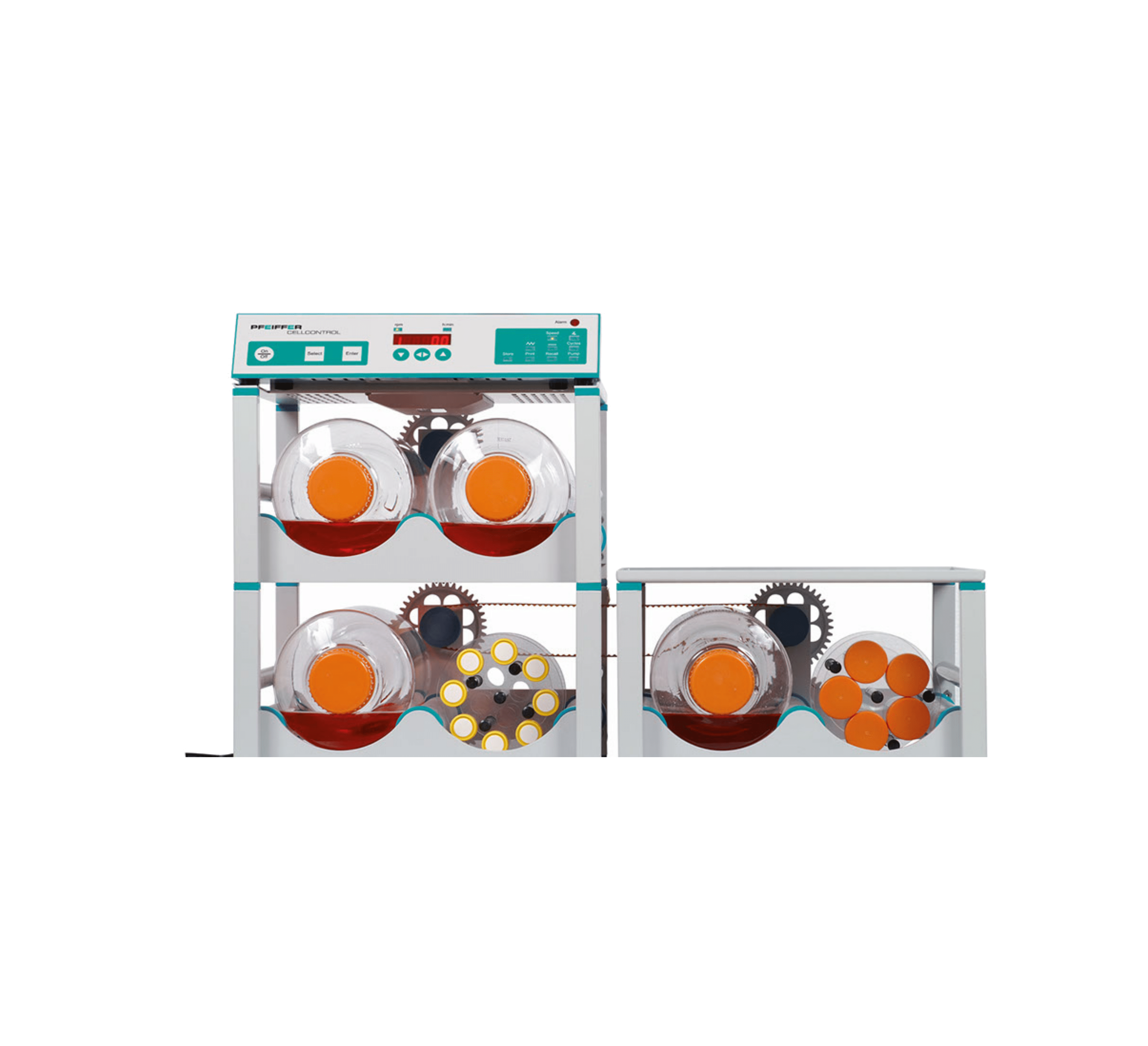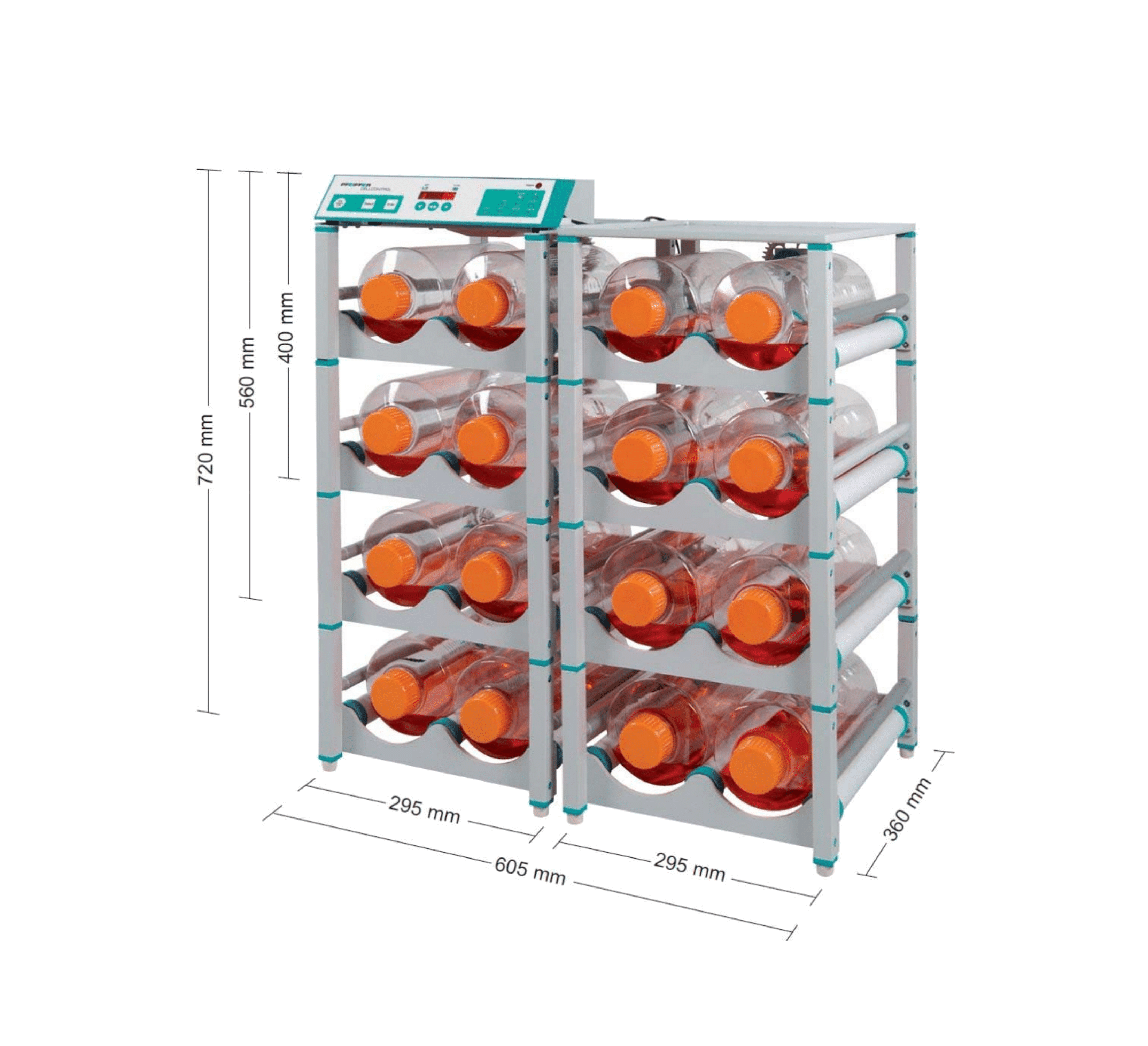 The modular design of the CELLROLL allows the user to easily scale-up production depending on the needs: one motor unit can control between one and eight bottle racks, each rack accommodating two standard roller bottles.