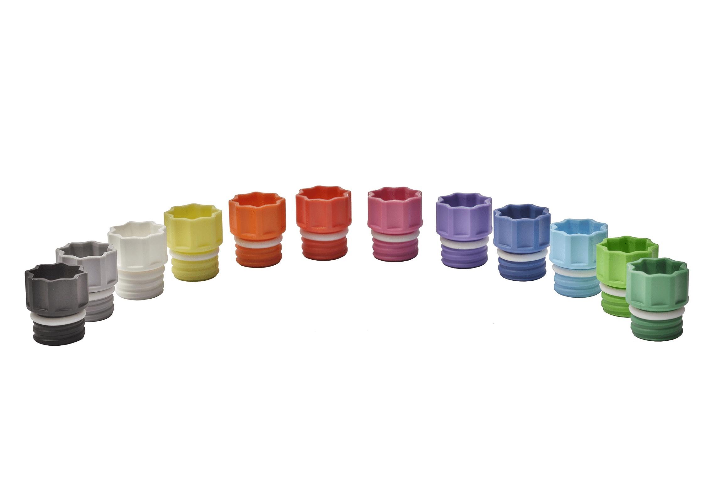 The threaded internal screw caps are compatible with 96-well (0.50ml, 0.75ml, 1.10ml, 1.40ml and 2.00ml), 48-well (4.00ml) and 24-well (6.00ml) size tubes.